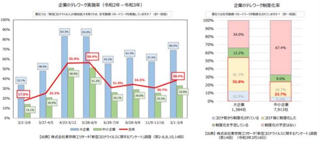 テレワーク実施率が大企業で 5 割、中小企業では 3 割…