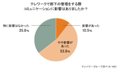 テレワークで部下の管理をする際のコミュニケーションへの影響について聞いたところ、「影響があった」(10.5%)「やや影響があった」(53.8%)の回答を合わせると、6割超が何らかの影響を感じている。