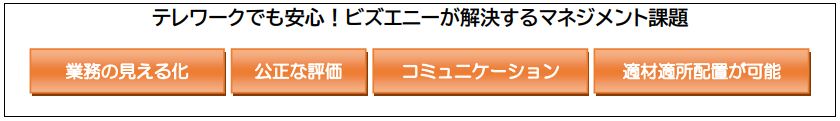 ビズエニーは、結果を出す確率を上げるための仕組みです。テレワークになり、マネージャーや同僚とのコミュニケーションが減り、人間関係や会社との関係性も希薄になっています。