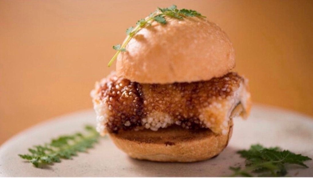 柔らかく蒸した天然うなぎにおかきをまぶして揚げ、鰻のタレをかける。さらに、ブルーベリーの醤油ソースとパッションフルーツ、木の芽も挟んだバーガー。