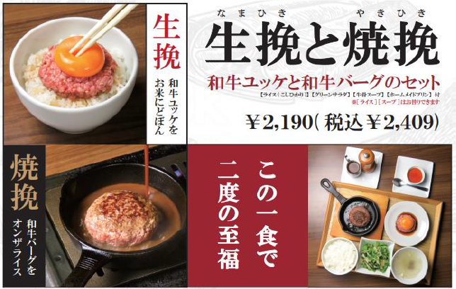 同じ牛肉でも挽肉で加熱したハンバーグと 55 度で 1 時間低温調理した後に挽肉状に加工した低温調理ユッケの味、食感の違いを是非味わっていただきたいという想いより誕生したメニュー。