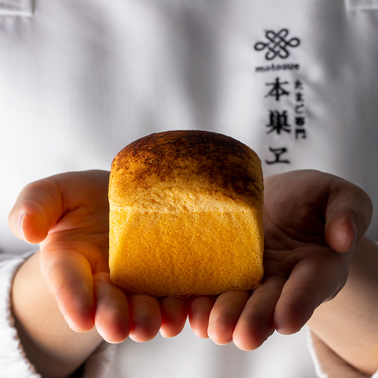 パンは本巣ヱの看板商品、「謹製 濃厚たまごパン」。こだわり選び抜いた卵のみを使用、秘伝の製造方法により焼き立て時は濃厚な卵の味わいと香り、ふんわりとろけるような口どけ。
