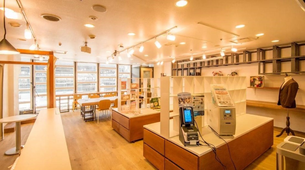 ・店舗には、コワーキングカフェや防音ミーティング BOX が併設され、くつろぎながら商談などを行える他、一般利用者への露出や販売もできる!