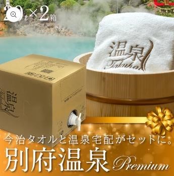 ギフトに最適な最高級今治タオルと 20L×2箱の温泉水を宅配。