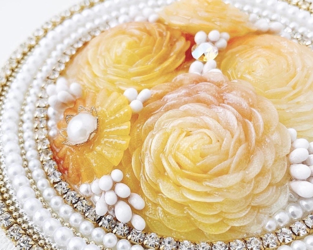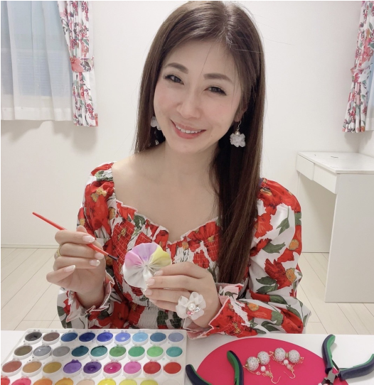 1本のリボンから⽣まれたアートの開発には5年以上を費やし、最初は野菜の⽪、サランラップ、アルミホイル、粘⼟など様々なもので試した。花の構造を調べるなか、リボンを⼿で触っていたら花の形になったことから現在のアートの原型が⽣まれた。リボン1本で独⾃の編み⽅、組み⽴て⽅をして、真っ⽩なリボンを⼿染めしコーティングした宝⽯のような作品が特徴。2021ミセス・グローバル・アース愛知で準グランプリ受賞。