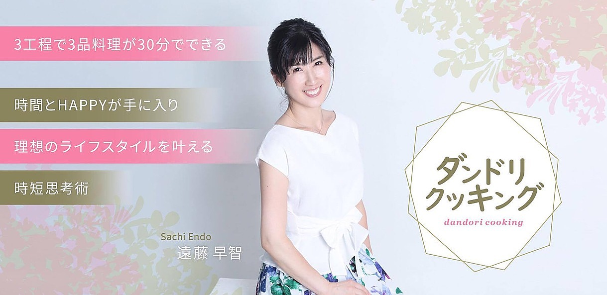 遠藤早智さんは、時間がなく料理が憂うつな人に、美味しく栄養価の高い料理3品を30分で作れる方法を伝授する「時短料理マイスター®」!家庭料理は勿論、パーティ料理や本格和食も30分で3品作れる「ダンドリクッキング」を、22年間で延べ 7000名以上に指導し、時間と心に余裕ができるようにサポート。
