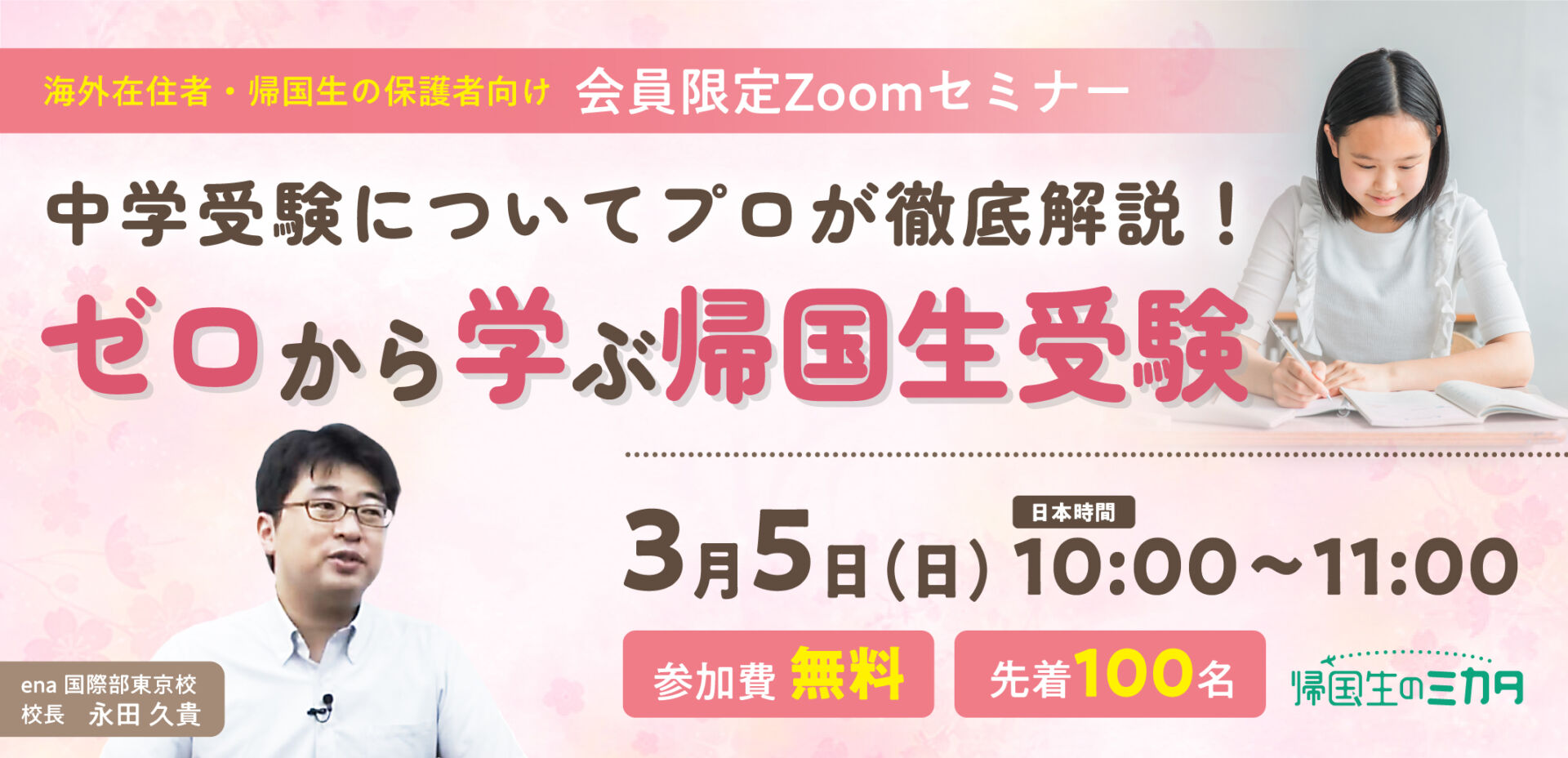 ena 国際部 東京校校長 永田久貴先生をゲストに招き、日本のみならず、シンガポール、香港、アメリカ、ブラジル、メキシコなど世界各国から100名以上の方にご視聴いただき、帰国生受験のいろはについて学びました。