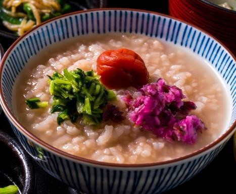 茶粥は、「2019年度 楽天トラベル朝ごはんフェスティバル」で京都1位を受賞した自慢の逸品!伝統栽培でお茶を⽣産する老舗・宇治の「長谷川栄製茶場」の碾茶の茎ほうじ茶を使⽤。