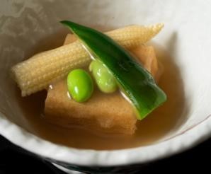 創業 1645 年、京都伏見にある「招徳酒造」から直送の酒粕を使⽤した粕汁も提供。京都の老舗「服部豆腐」の厚揚げを使用した「飛厚揚げの夏野菜餡掛け」は、白出汁でじっくりと炊き上げた厚揚げに夏野菜をふんだんに使用した餡を掛けた品。