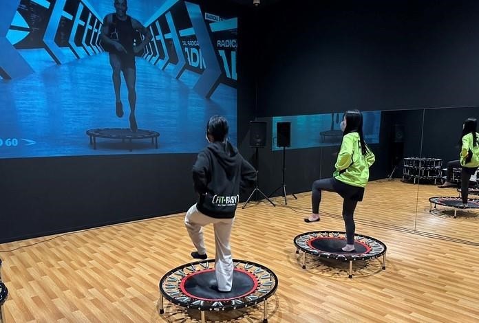 ミニトランポリンを使ったバーチャルレッスンでは、トランポリン上を動き回る有酸素運動で、脂肪燃焼や代謝アップ、関節に負担をかけずに体幹や下半身の強化を目指す。