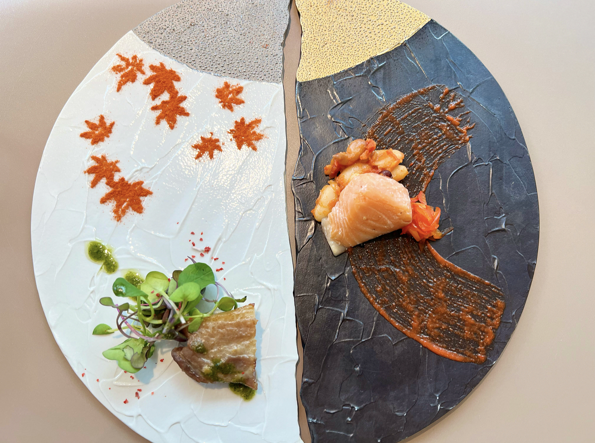 「銀閣寺と金閣寺の紅葉」を模したメイン料理