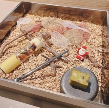 12 月には“クリスマスの京都”を表現したコースを提供!前菜の「サンタの森」から始まり、京都の冬の風物詩「ジョミナリエ」のイルミネーションを表現した八寸、京都・北山のキャンドルナイトを抹茶のガナッシュなどで表現したデザートなどを提供。