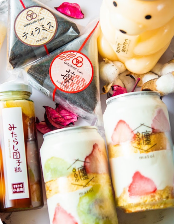 かわいいネオンのライトの内装や、コンビニやスーパーには並ばない見た目がおむすびに見えるスイーツ「おむすびケーキ」など、全国の映えスイーツを100種類近く取り揃えている。