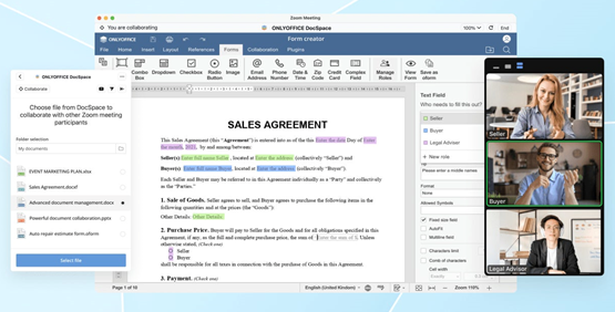 一方、ZoomとONLYOFFICE DocSpaceの連携用公式アプリでは、共同編集が可能!例えば、Zoom会議中に議論しながら、販売契約書や契約書などのデータに記入することができる!