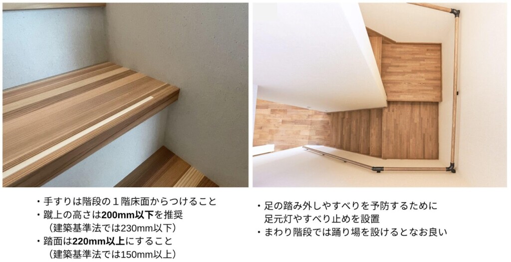 建築基準法施行令では「床から1,000mの部分」は手すりもしくは側壁の義務は生じない。狭い家だと階段幅も狭く、段差の奥行きが狭いことが多く、踏み外しによる転落リスクが高い。