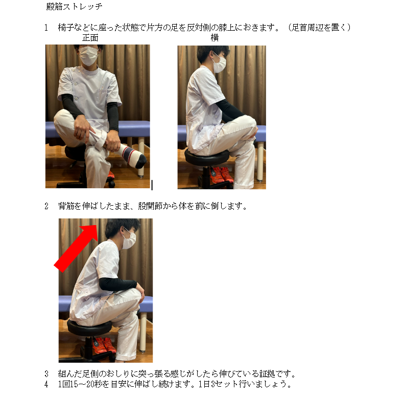 ①殿筋ストレッチは椅子などに座った状態で片方の足を反対側の膝上におく。(足首周辺を置く)