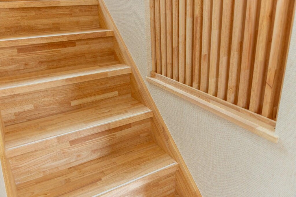 狭い家だと階段幅も狭く、段差の奥行きが狭いことが多く、踏み外しによる転落リスクが高い。そこで、階段は緩やかな勾配になるように設定し、手すりは1段目まで取り付ける。滑り止めも効果的。