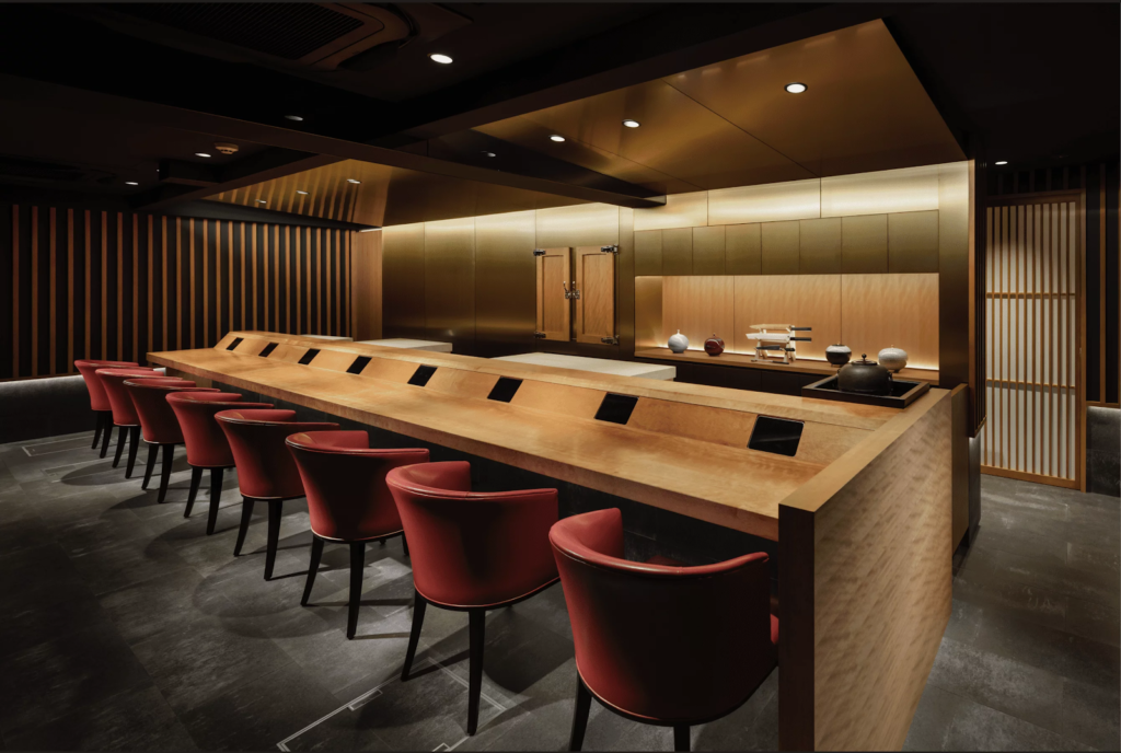 中を開けると真鍮ボタンが出現。ボタンを押すと中からタキシードの男性スタッフ、スーツの女性スタッフが出迎えてくれる。まるで三ツ星ホテルのようなサービスを鮨屋で味わえる。