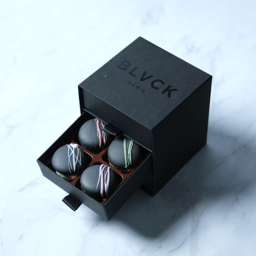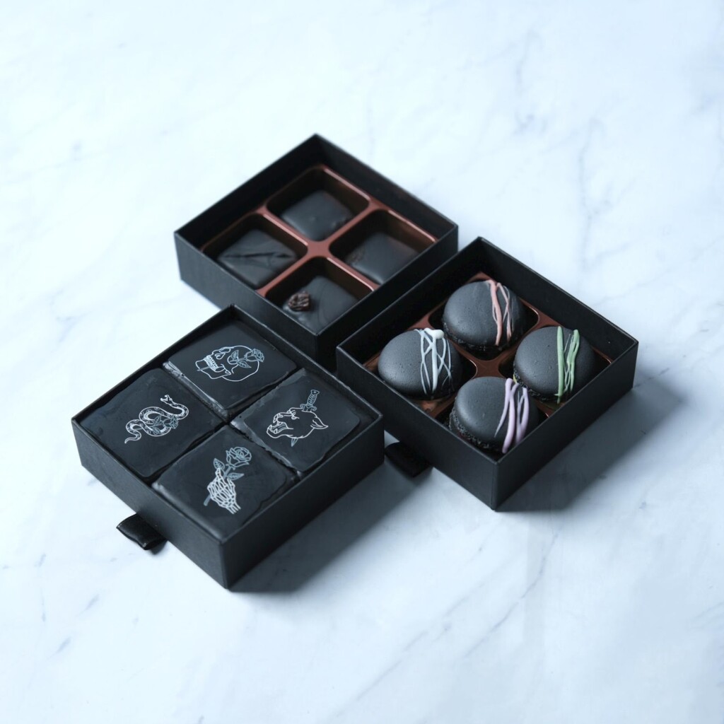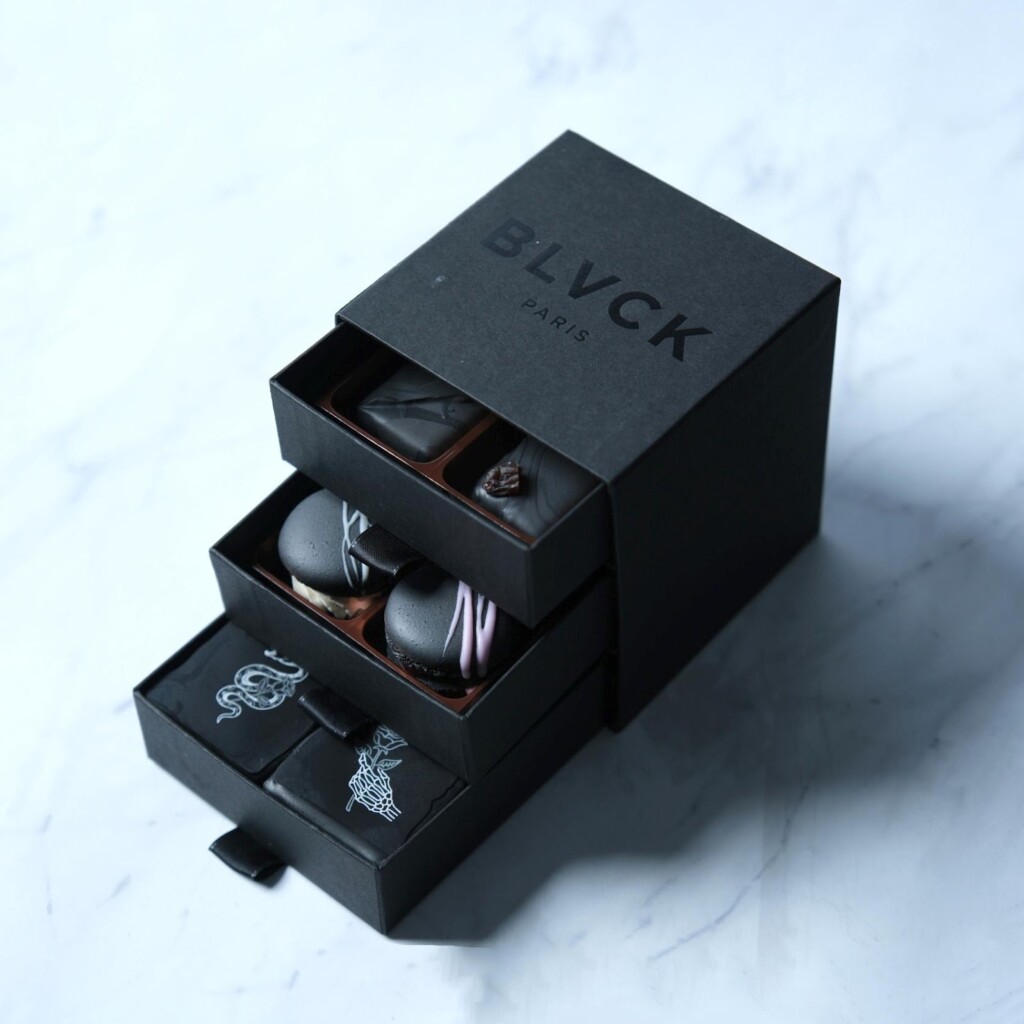 【ボンボンショコラ、マカロン、バターサンド全て真っ黒のバレンタインセット】引き出しの中には高級感あふれるブラックスイーツが味わえる「アフターヌーンティーセット」