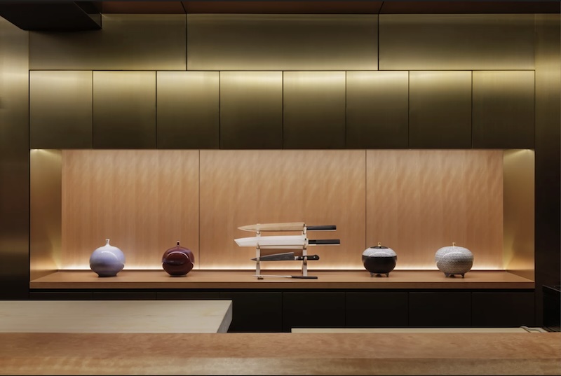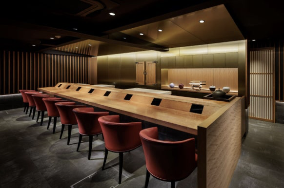 真鍮を施した内装、アフリカンチェリーを使用した9mを超える1枚板のカウンター、iPadでのメニュー表示など、これまでの鮨屋のイメージを覆す店内になっており、内装費だけでも約5800万円のコストがかかっている。