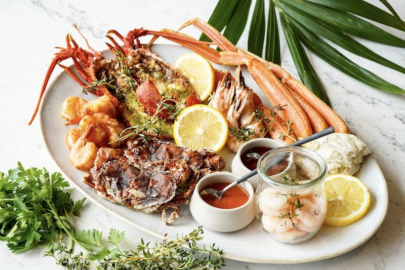 海老をいろんなスタイルで楽しめる贅沢なプラッター。 香草バターで香り高く焼き上げた伊勢海老は、1尾まるごと使用!