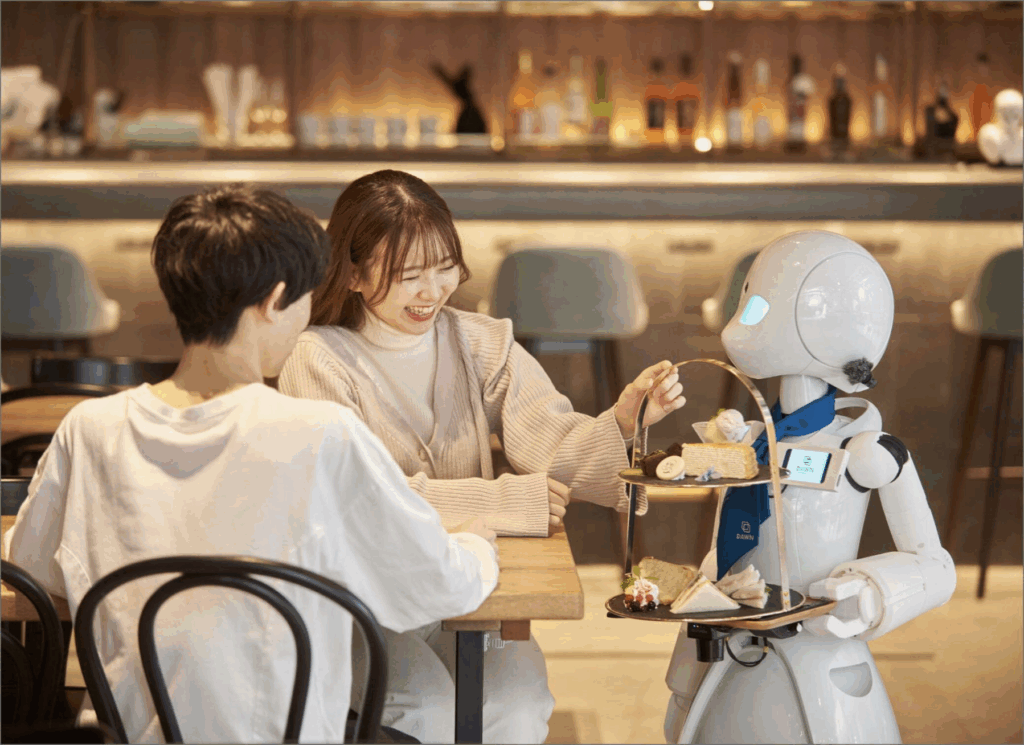 ⇒“パイロット”がOriHimeを遠隔操作し、受付・メニューの配膳・お客さんとの会話を行う。