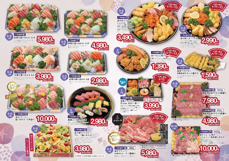 お寿司やお刺身、焼肉、オードブル、フルーツ盛りなど、華やかなひとときを彩る「綿半のお盆のごちそう」。大切な方々との夏のひとときを、ぜひ綿半でお楽しみください。