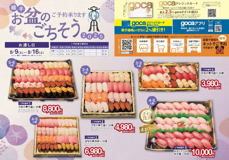株式会社綿半ホームエイドは、お盆のごちそう予約を綿半スーパーセンター各店・ネットショッピングの店舗受取りサービス「わたピック」にて開始いたしました。