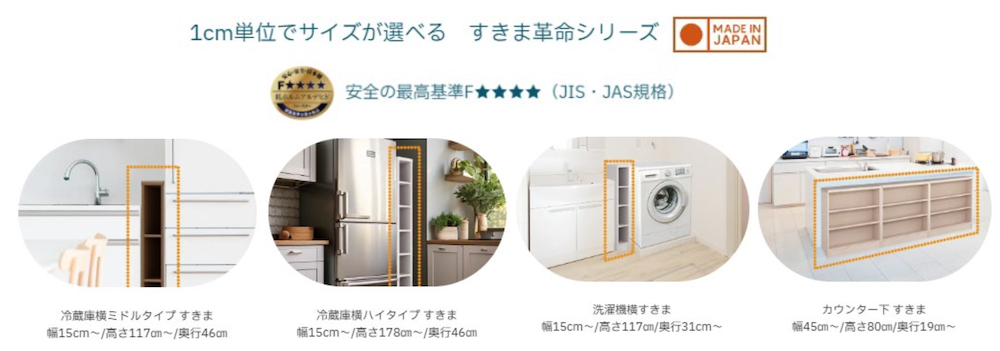 1センチ単位からのオーダー収納家具や完成品家具など、高さ・奥行・カラーなど豊富なサイズバリエーションを取揃えています。また、シックハウス症候群の原因となるホルムアルデヒドの放散量が最も少ない、最高基準の F★★★★(エフフォースター)家具シリーズも取揃えていますので、お子さまやアレルギーのある方も安心してお使いいただけます。