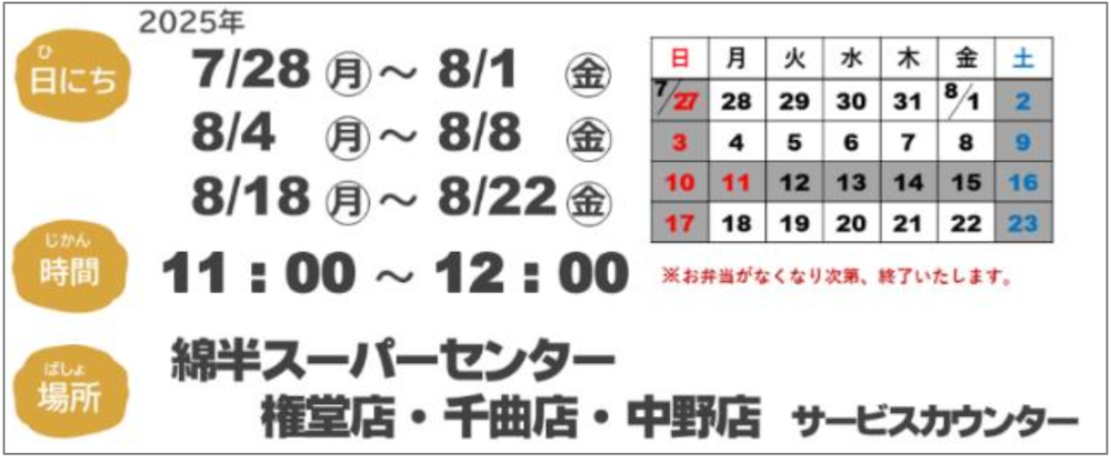 株式会社綿半ホームエイドは、この夏、綿半スーパーセンター権堂店・千曲店・中野店で「わたはん子ども食堂」を開催いたします。