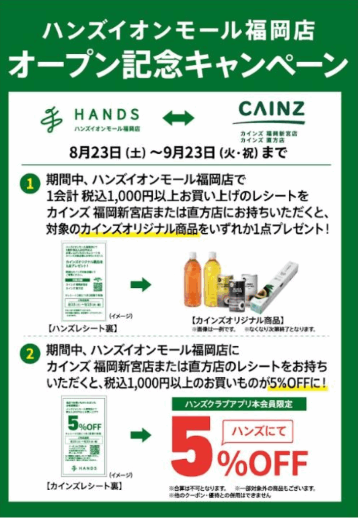 ● カインズ福岡新宮店または直方店のレシートでハンズ イオンモール福岡店のお買物※1 が 5%オフ※2 になります