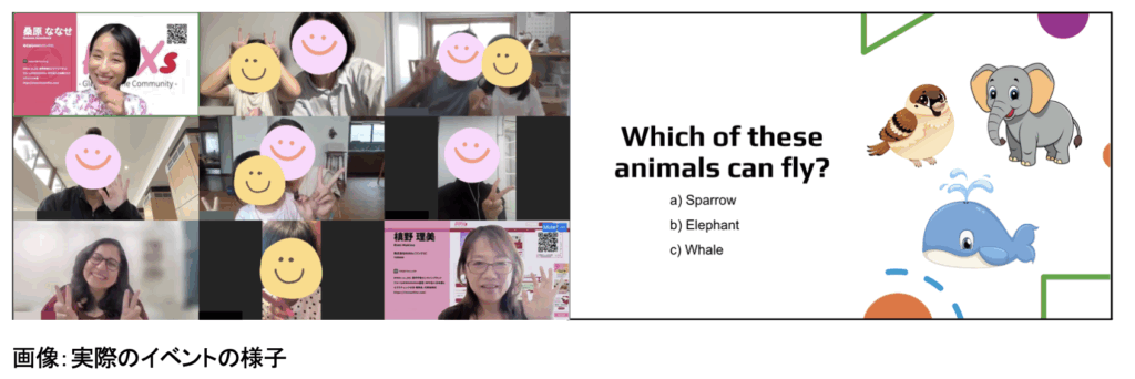 英語初心者でも楽しめるよう、Yes/Noで答えられるクイズやジェスチャーを取り入れ、コミュニケーションのハードルを下げています。