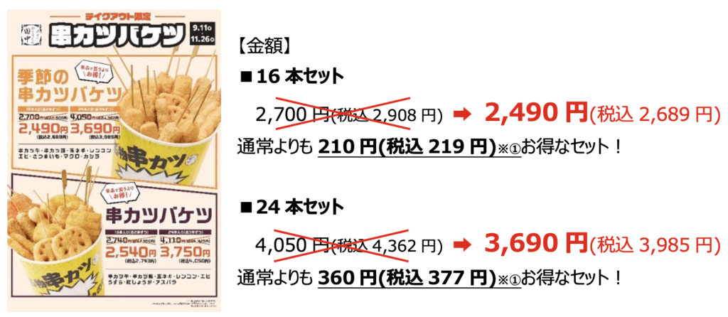 また、定番の串カツや季節限定の串カツのセットが単品で購入するよりもお得な金額設定になっています。