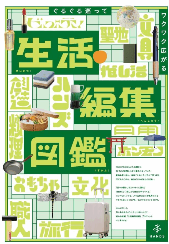 ハンズを訪れた人が「暮らし」をテーマに集められた“モノ・コト・ヒト”と出会い、日々のくらしをよりよくアップデートする編集感覚を持ち帰ることができる、”訪れる図鑑”としてリブランディングするプロジェクトです。