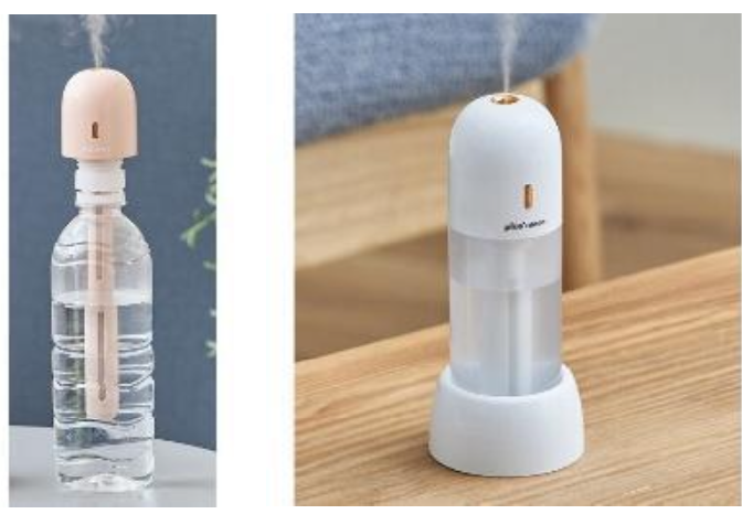 「ペットボトルにつける」「水の入った容器に入れる」「専用タンクで付属スタンドに立てる」と3通りの使い方ができる加湿器。