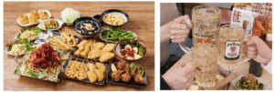 キャベツ、枝豆、梅きゅうり、ポテトサラダ、チューリップから揚げ、ポテトフライ、マカロニサラダカレー風味、 ちりとり鍋、(選べる〆付き)