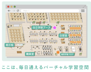 バーチャル仮想空間の提供: 塾専用の仮想空間「メタバース教室」を提供。オンライン学習は孤独になりがち、というイメージを覆すのが「サインワンオンライン校」のバーチャル仮想空間。仮想空間では、クラスメイトとチャットで話したり、一緒に自習に取り組んだりすることができる。