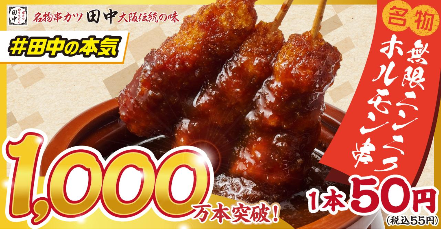串カツ田中が本気で開発した新名物「無限ニンニクホルモン串」(無限串)は、圧倒的なコストパフォーマンスと、そしてお酒と相性抜群の“やみつき感”のある味わいが多くのお客様からご支持をいただいている結果、販売開始から半年で 1,000 万本を突破しました!