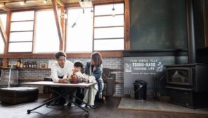 以前にも築 35 年の元機織り工場をヤギに会えるヤギ民泊「都留 BASE 」として生まれ変わらせたり、更に古い築 50 年の物件を再生させて創り上げた「コテージくつろぎ」はサウナや BBQ、珍しいペレットストーブがあったり、宿の吹き抜けには子供が大喜びするアスレチックネットが張ってある人気民泊にしています。