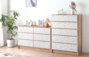 「テラファニ(Terrafurni)」は、タンスのゲンが展開している“Terrazzo furniture(テラゾーファーニチャー)”を略したシリーズ名称です。イタリア発祥の建材である「テラゾー(terrazzo)」の美しい意匠性を家具に落とし込み、日常空間に馴染むデザインに仕上がっています。建築やインテリアで再注目されるテラゾー柄を、木目調と組み合わせてナチュラルモダンな雰囲気に演出します。