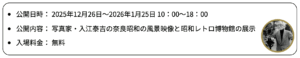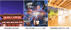 世界遺産にも登録されている平城宮跡歴史公園の県営エリア・天平みつき館において、令和7年12月26日(金)から令和8年1月25日(日)まで、 「昭和100年物語プレイバック奈良in平城京」を開催します。