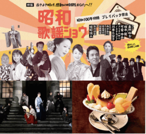 デザートショーでは昭和の名曲の数々を奈良の歌手が歌い継ぎ、奈良の役者を中心とした昭和の時代劇や奈良大和路の風物を撮り続けた写真家・入江泰吉の映像ショー、昭和の風景クイズ、昭和レトロ展示など昭和尽くしの2時間半をお楽しみいただきます。