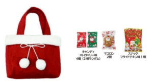 3種類(キャンディ・焼き菓子・スナック菓子)のお菓子が入ったクリスマスデザインのミニバッグ。赤と白のクリスマスカラーのミニバッグは飾っても華やか。