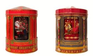 英国生まれのカルーセルブリキオルゴール缶。音楽に合わせてメリーゴーランドのように絵柄が回転し、クリスマス気分を盛り上げるアイテム。中には国産ビスケットが入っています。