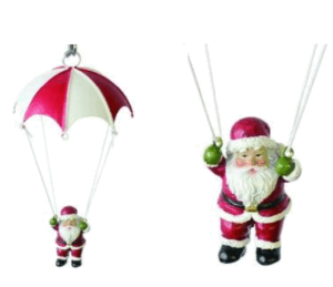 バネのついた動きのあるクリスマスオーナメント。クリスマスツリーはもちろん、天井からつるしたりドアにぶら下げたりして楽しむこともできます。パラシュートで空から降りてくる姿をビヨンビヨンとしたバネの動きで表現。