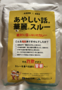 啓蒙活動の一環で、地元の奈良県警とカレー「あやしい話は華麗にスルー」を共同開発。 →詐欺被害に遭わないノウハウをパッケージに記載し、地域住民に配布している。 |