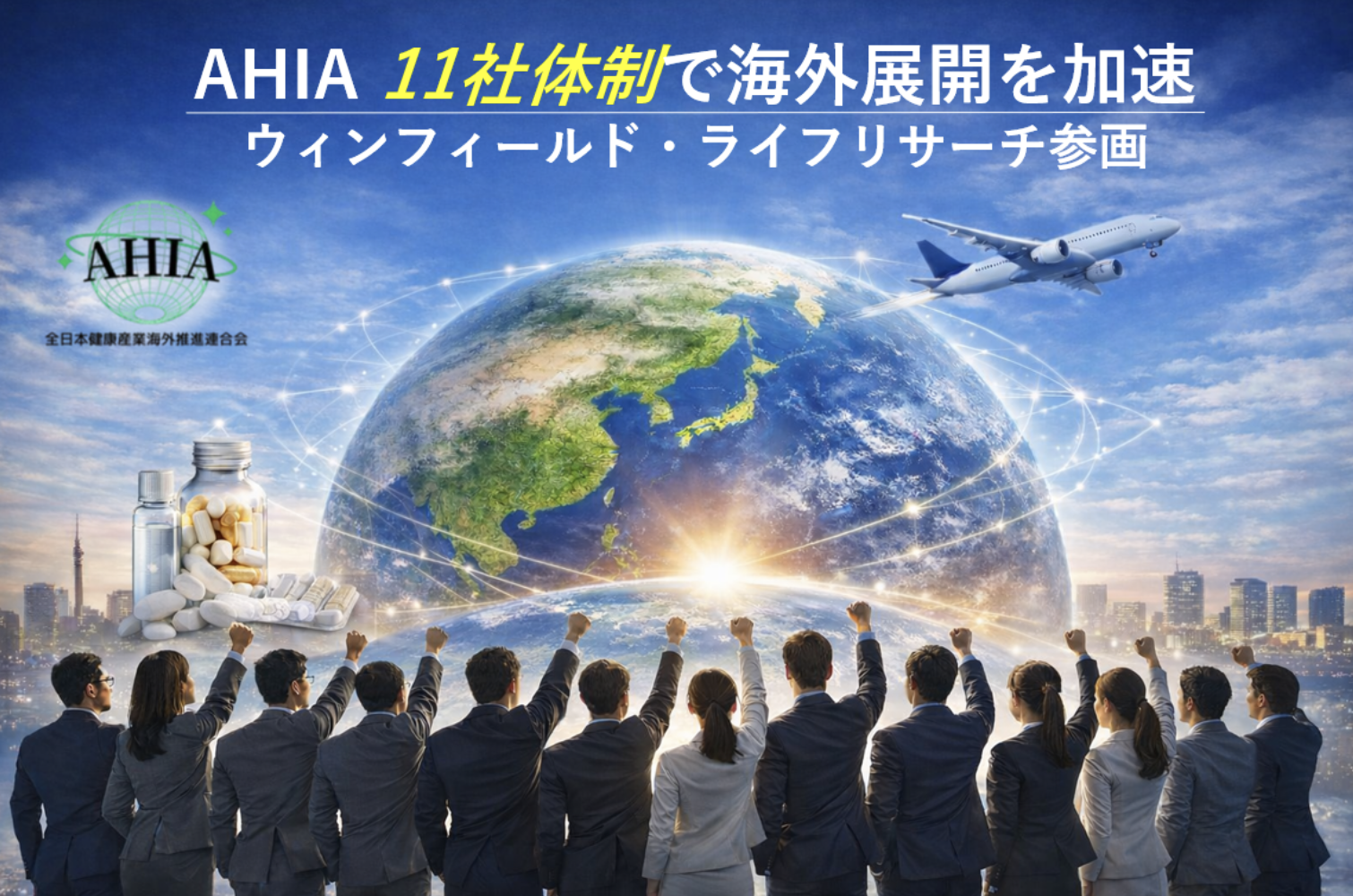 一般社団法人 全日本健康産業海外推進連合会(略称:AHIA)は、ウィンフィールド・ライフリサーチの新規参画を迎え、医薬品・化粧品・健康関連分野を横断する11社体制の連合体へと拡大しました。