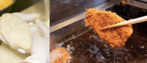 サシ( 脂 )に含まれるオレイン酸由来の「 口どけの良さ」を損なわないよう、知多家の熟練職人が最適な温度と時間を見極め、シンプルに揚げてご提供 。