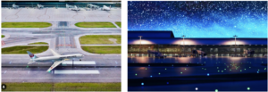 ▲1/80 サイズでも「空港エリア」は世界最大級の広さのジオラマです。大きなエンジン音を 伴って飛行機が離発着します。壁面液晶モニターに広大な瀬戶内海が映し出されています。