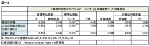 図ー3は、重回帰分析により、ウェルビーイング(精神的豊かさ)は何によって引き起こされるのかを表にしたものです。本調査の分析から、「現在所属している組織への共鳴」、「人生の目的と会社の方向性との重なり」、「仕事の満足」がかけ合わさることで、ウェルビーイングにつながりやすいことがわかりました。つまり、企業は従業員に対して、仕事におけるウェルビーイングを促すためには、この3つの要素を重視していく必要があることがわかります。